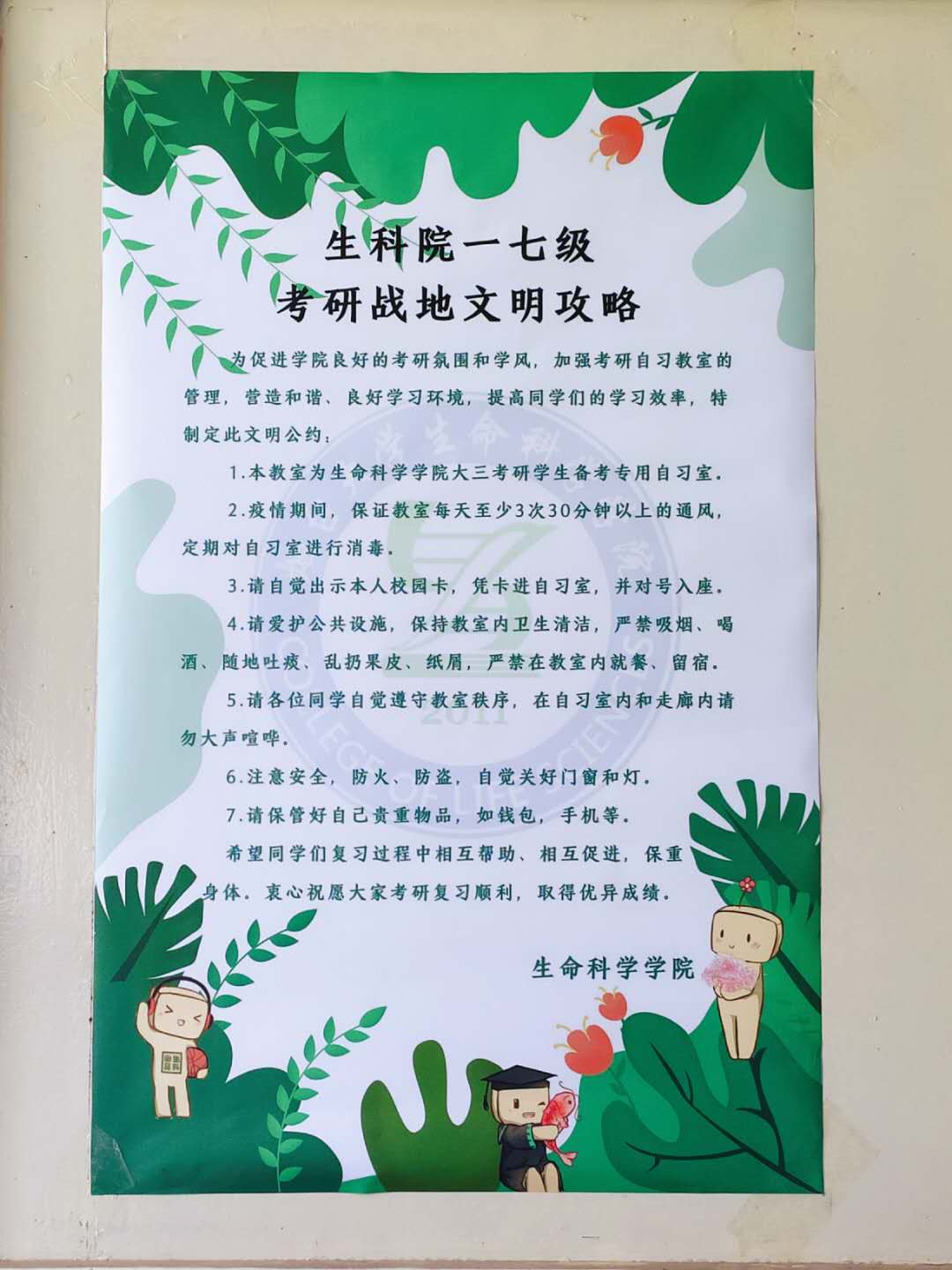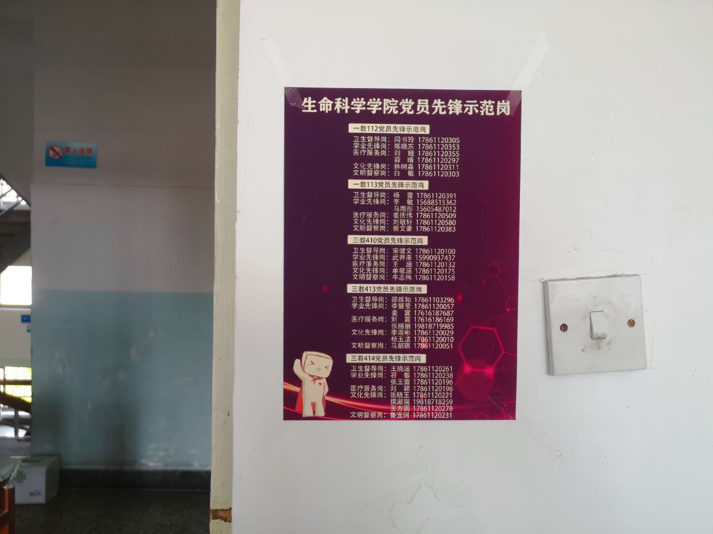 党员先锋,奉献先行,生科院党总支结合实际需求,本着“出实招、办实事、求实效”的目的,将“党员先锋岗”设置到考研教室,通过医疗服务岗、学业先锋岗、卫生督导岗、文明督察岗、文化先锋岗等五个岗位的设置,切实发挥党员先锋示范作用,缓解暑期校内备考学子的预见性困扰。近日,jinnianhui金年会“党员先锋岗”分别在第一教学楼、第三教学楼挂牌,返校的17级党员全体上岗,覆盖到全部考研教室,同时将各个岗位的党员进行公示。卫生督导岗保障环境整洁,按照疫情防控要求,确保教室每日三次通风、一人一桌、定期消毒等日常管理。学业先锋岗负责最新备考资讯的搜集整合及发布,对备考过程中出现的问题,进行初步的集中整理,联系或询问专业教师给予解答;医疗服务岗负责管理学院配备的医疗箱、测温仪及藿香正气水、板蓝根、感冒冲剂等常用非处方药,解决封闭期间学生前往校医院的不便;文化先锋岗负责开通文体放松小站,每周播放电影及音乐会视频、组织体育活动等,缓解备考压力;文明督察岗按照《生科院17级考研战地文明攻略》,督促文明言行,确保考研教室安静秩序的学习环境。