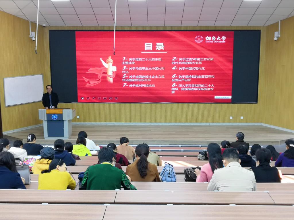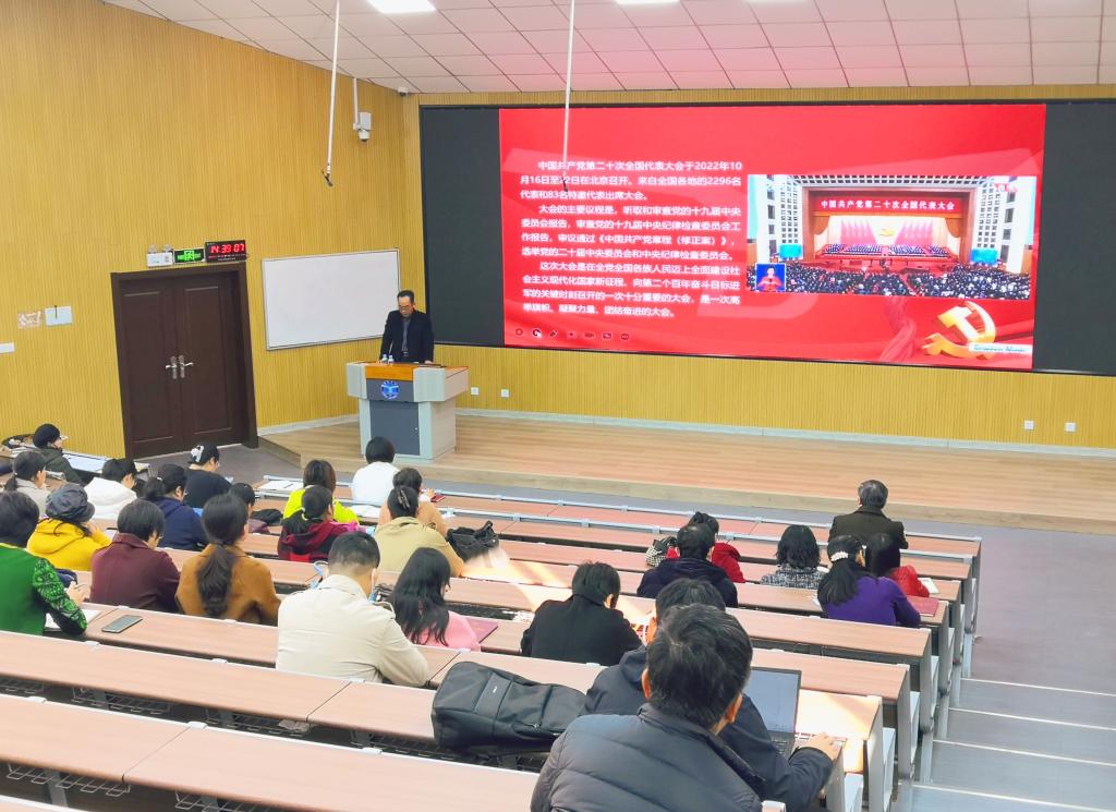 王者旭在宣讲中紧扣党的二十大主旨内涵与重要意义,围绕中国式现代化、马克思主义中国化时代化、过去5年的工作和新时代10年的伟大变革、全面建设社会主义现代化国家的目标任务、坚持党的全面领导和全面从严治党、持续推进学校高质量发展等八个方面展开,同时表明,全体教职工都要坚持把思想和行动统一到大会精神上,坚守共产主义信仰和立德树人根本任务,戮力同心、勇毅拼搏,为学校高水平大学建设目标贡献生科力量。