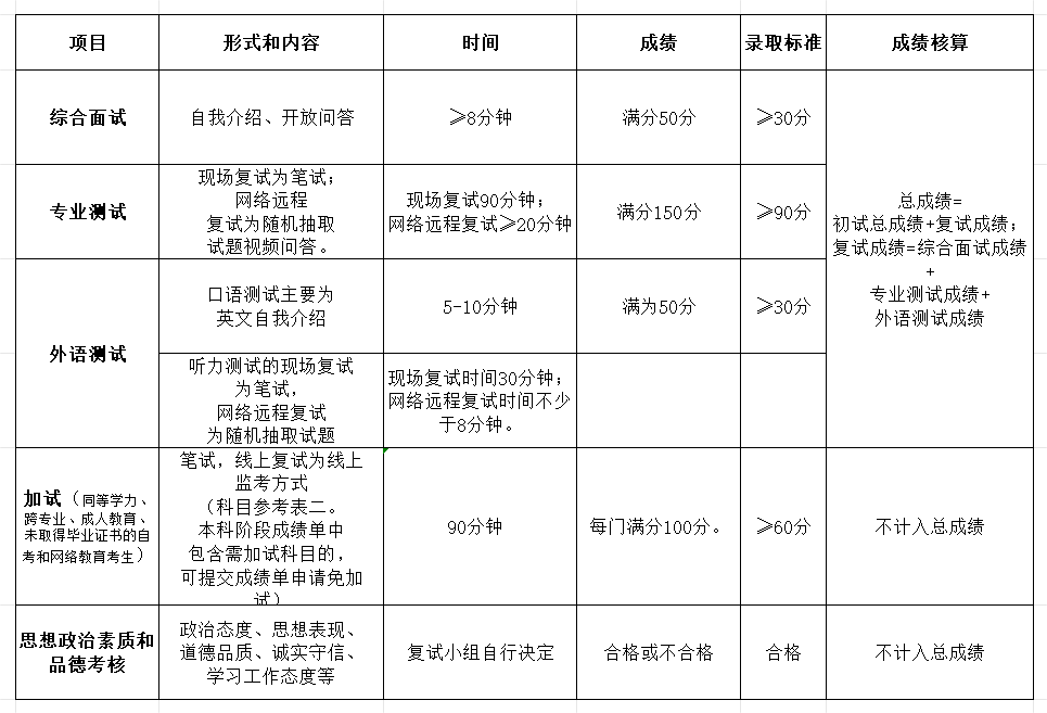 复试成绩=综合面试成绩(满分50分)+专业测试成绩(满分150分)+外语测试成绩(满分50分)。