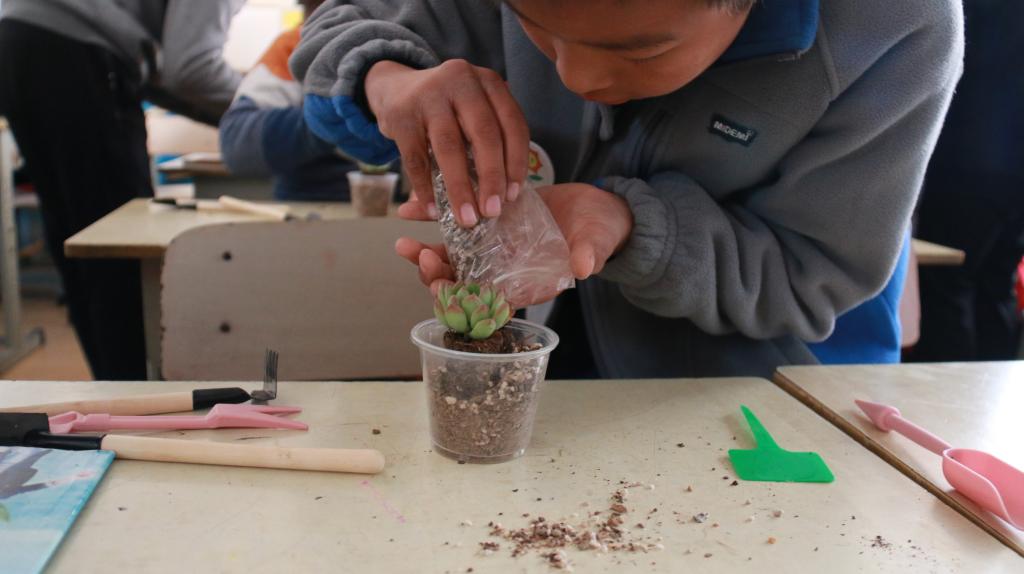 下午两点,第二课正式开始。主讲人以PPT讲解为主,中间穿插精心准备的小剧场表演,通俗易懂地传递“讲文明,懂礼貌”的重要性。随后,同学们在小组负责人的引导下开始进行本次活动的重要环节——植物栽培。在种植过程中,同学们有序选取心仪的多肉植物,对有困难的同学施以援手,彼此之间彬彬有礼、相互协作,齐心协力将多肉植物种植盆中。课堂结束后,同学们在志愿者的引导下完善档案页,写下自己的课堂收获以及对下一课的期望。孩子们在档案中写到:“今天课堂上我亲手种下属于自己的多肉,还学会了与人相处要文明礼貌,我期待下一次哥哥姐姐们再次来为我们上课。”至此,第二课圆满结束。