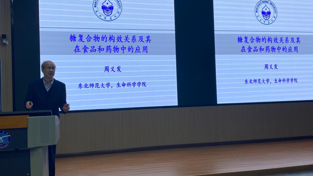 5月10日上午,东北师范大学jinnianhui金年会院长周义发教授一行四人到我院考察交流。周教授在二教101为近200名本科生和研究生做了题为《糖复合物的构效关系及其在食品和药物中的应用》的学术报告,并就研究生和本科生的学习及科研工作给予了实际的指导。随后,周教授一行还就学科专业建设尤其是团队建设等与学院进行了深入的交流,学院领导班子成员、学科和专业负责人参加了座谈会。