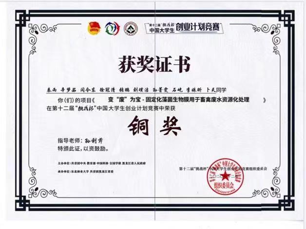 学院《变“废”为宝-固定化藻菌生物膜用于畜禽废水资源化处理》项目获得第十二届挑战杯竞赛铜奖